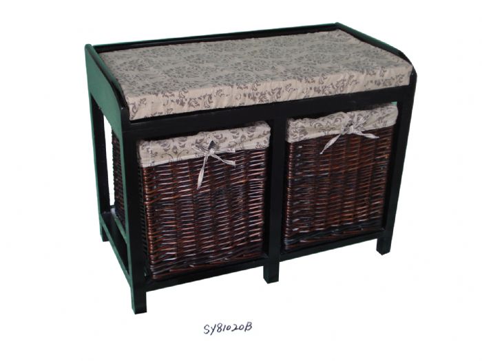 bench with cushion and willow baskets